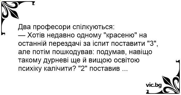 — Хотів недавно одному "красеню" на останній перездачі за іспит поставити "3", але потім пошкодував: подумав, навіщо такому дурневі ще й вищою освітою психіку калічити? "2" поставив ...