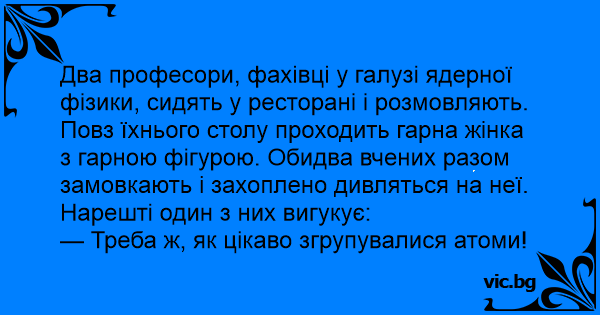 Два професори, фахівці у галузі ядерної фізики, сидять у ресторані і розмовляють. Повз їхнього столу проходить гарна жінка з гарною фігурою. Обидва вчених разом замовкають і захоплено дивляться на неї.
