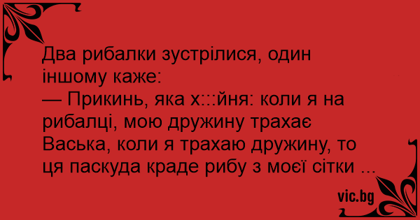 — Прикинь, яка х:::йня: коли я на рибалці, мою дружину трахає Васька, коли я трахаю дружину, то ця паскуда краде рибу з моєї сітки ...
