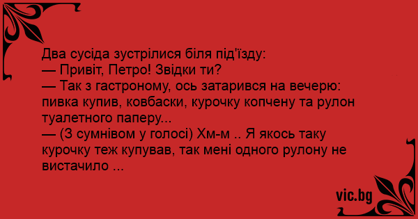 — Так з гастроному, ось затарився на вечерю: пивка купив, ковбаски, курочку копчену та рулон туалетного паперу...