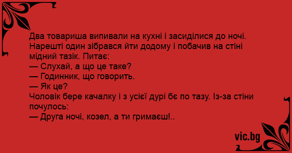 Чоловік бере качалку і з усієї дурі бє по тазу. Із-за стіни почулось: