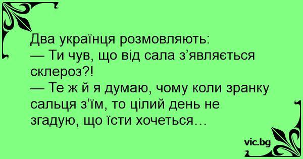 — Те ж й я думаю, чому коли зранку сальця з’їм, то цілий день не згадую, що їсти хочеться…