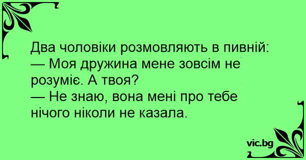 — Моя дружина мене зовсім не розуміє. А твоя?