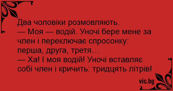 — Ха! І моя водій! Уночі вставляє собі члeн і кричить: тридцять літрів!