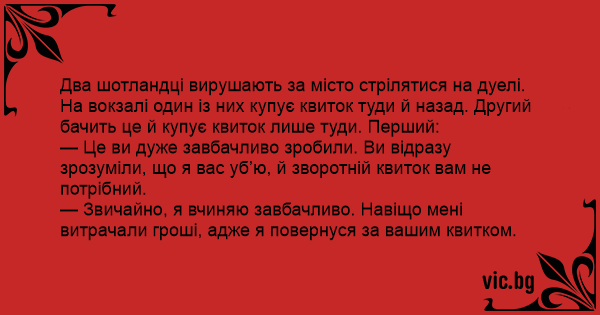 Два шотландці вирушають за місто стрілятися на дуелі. На вокзалі один із них купує квиток туди й назад. Другий бачить це й купує квиток лише туди. Перший: