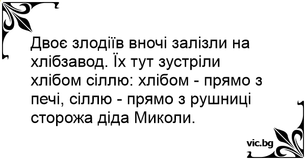 Двоє злодіїв вночі залізли на хлібзавод. Їх тут зустріли хлібом сіллю: хлібом - прямо з печі, сіллю - прямо з рушниці сторожа діда Миколи.