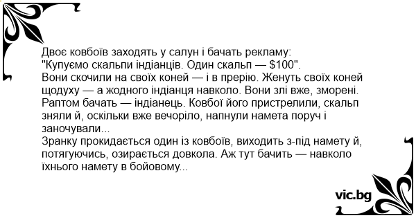 Двоє ковбоїв заходять у салун і бачать рекламу: