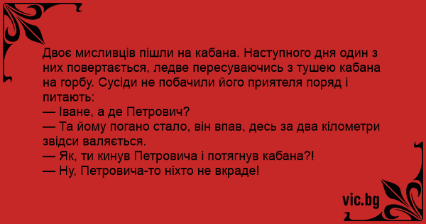 Двоє мисливців пішли на кабана. Наступного дня один з них повертається, ледве пересуваючись з тушею кабана на горбу. Сусіди не побачили його приятеля поряд і питають: