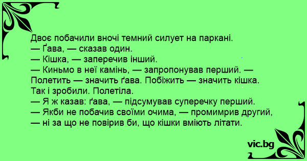 — Киньмо в неї камінь, — запропонував перший. — Полетить — значить ґава. Побіжить — значить кішка.
