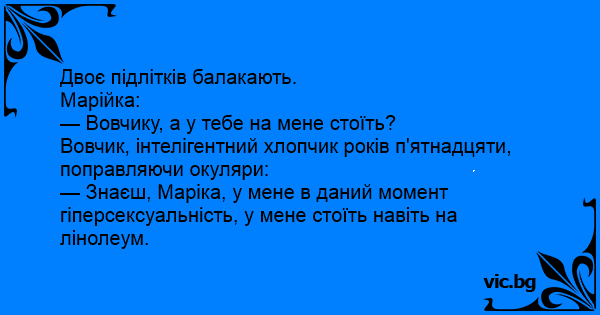 — Знаєш, Маріка, у мене в даний момент гіперсексуальність, у мене стоїть навіть на лінолеум.