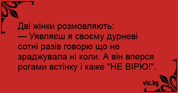 — Уявляєш я своєму дурневі сотні разів говорю що не зраджувала ні коли. А він вперся рогами встінку і каже "НЕ ВІРЮ!".
