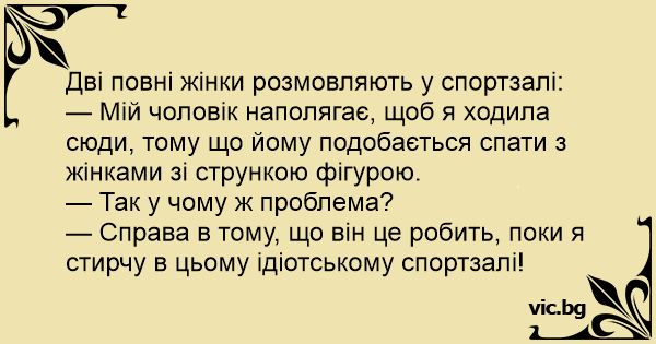 — Мій чоловік наполягає, щоб я ходила сюди, тому що йому подобається спати з жінками зі стрункою фігурою.