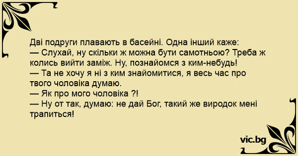 — Та не хочу я ні з ким знайомитися, я весь час про твого чоловіка думаю.
