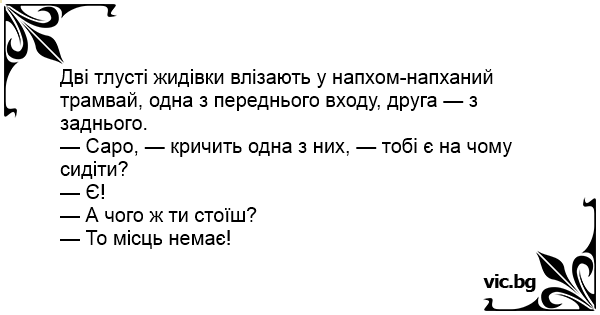 Дві тлусті жидівки влізають у напхом-напханий трамвай, одна з переднього входу, друга — з заднього.