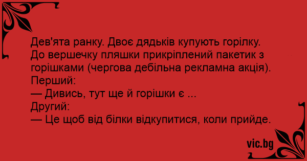 Дев'ята ранку. Двоє дядьків купують горілку. До вершечку пляшки прикріплений пакетик з горішками (чергова дебільна рекламна акція).