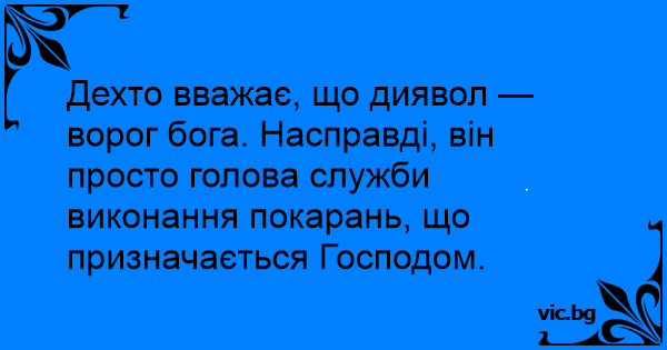 Дехто вважає, що диявол — ворог бога. Насправді, він просто голова служби виконання покарань, що призначається Господом.