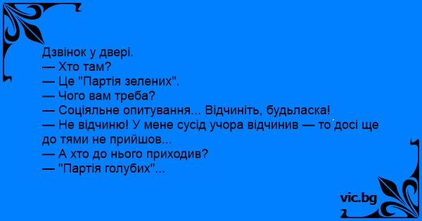— Не відчиню! У мене сусід учора відчинив — то досі ще до тями не прийшов...