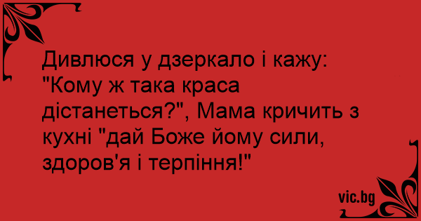 "Кому ж така краса дістанеться?", Мама кричить з кухні "дай Боже йому сили, здоров'я і терпіння!"