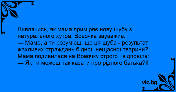 — Мамо, а ти розумієш, що ця шуба - результат жахливих страждань бідної, нещасної тварини?
