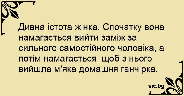 Дивна істота жінка. Спочатку вона намагається вийти заміж за сильного самостійного чоловіка, а потім намагається, щоб з нього вийшла м'яка домашня ганчірка.