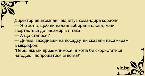 — Я б хотів, щоб ви надалі вибирали слова, коли звертаєтеся до пасажирів літака.