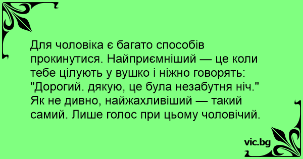 Для чоловіка є багато способів прокинутися. Найприємніший — це коли тебе цілують у вушко і ніжно говорять: