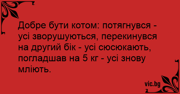 Добре бути котом: потягнувся - усі зворушуються, перекинувся на другий бік - усі сюсюкають, погладшав на 5 кг - усі знову мліють.