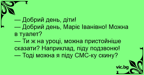 — Ти ж на уроці, можна пристойніше сказати? Наприклад, піду подзвоню!