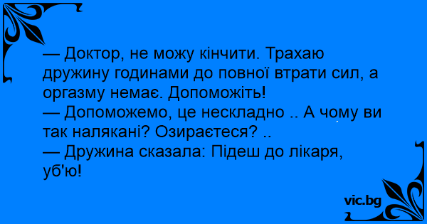 — Доктор, не можу кінчити. Трахаю дружину годинами до повної втрати сил, а оргазму немає. Допоможіть!