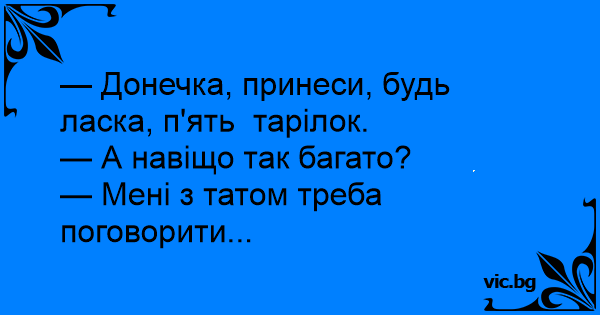 — Доню, принеси мені 5 тарілок із кухні! — Навіщо, мамуню? — Мені треба про дещо поговорити з твоїм татком.