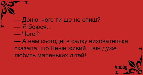 — А нам сьогодні в садку вихователька сказала, що Ленін живий, і він дуже любить маленьких дітей!
