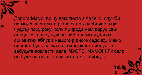 Дорога Мамо, пишу вам листа з далекої служби і не можу не згадати рідне село - особливо в цю чудову пору року, коли природа нам дарує свої плоди. Як наяву чую ніжний аромат чудових соковитих яблук з нашого рідного садочку. Мамо, вишліть будь ласка в посилці кілька яблук. І не забудьте покласти сала. ЧУЄТЕ, МАМО!!! Як сало не буде влазити, то викинте геть ті яблука!