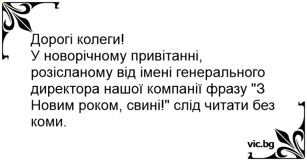 У новорічному привітанні, розісланому від імені генерального директора нашої компанії фразу "З Новим роком, свині!" слід читати без коми.