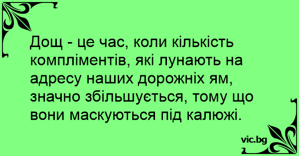 Дощ - це час, коли кількість компліментів, які лунають на адресу наших дорожніх ям, значно збільшується, тому що вони маскуються під калюжі.