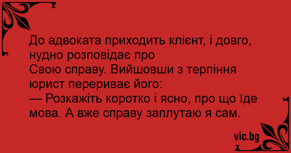 Свою справу. Вийшовши з терпіння юрист перериває його:
