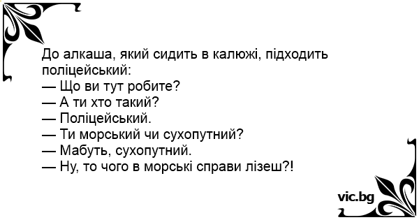 Български English Deutsch Español Русский Français Italiano Ελληνικά Македонски Türkçe До алкаша, який сидить в калюжі, підходить поліцейський: — Що ви тут робите? — А ти хто такий? — Поліцейський. — Ти морський чи сухопутний? — Мабуть, сухопутний. — Ну, то чого в морські справи лізеш?! Português Polski Svenska Nederlands Dansk Norsk Suomi Magyar Româna Čeština Lietuvių Latviešu Hrvatski