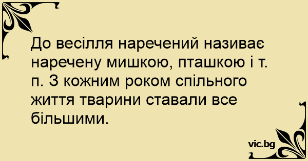 До весілля наречений називає наречену мишкою, пташкою і т. п. З кожним роком спільного життя тварини ставали все більшими.