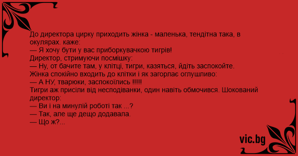 До директора цирку приходить жінка - маленька, тендітна така, в окулярах. каже: