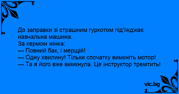 Учебен автомобил се приближава до бензиностанцията със страшен рев. На волана - жена: - Напълнете резервоара. - Първо изключете двигателя, моля! - Изключен е. Рева и тресенето е от инструктора!