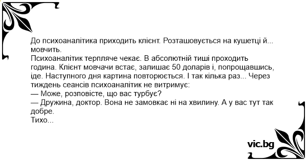 Психоаналітик терпляче чекає. В абсолютній тиші проходить година. Клієнт мовчачи встає, залишає 50 доларів і, попрощавшись, іде. Наступного дня картина повторюється. І так кілька раз... Через тиждень сеансів психоаналітик не витримує: