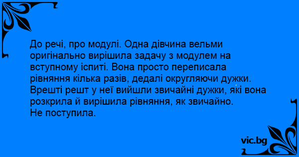 До речі, про модулі. Одна дівчина вельми оригінально вирішила задачу з модулем на вступному іспиті. Вона просто переписала рівняння кілька разів, дедалі округляючи дужки. Врешті решт у неї вийшли звичайні дужки, які вона розкрила й вирішила рівняння, як звичайно.