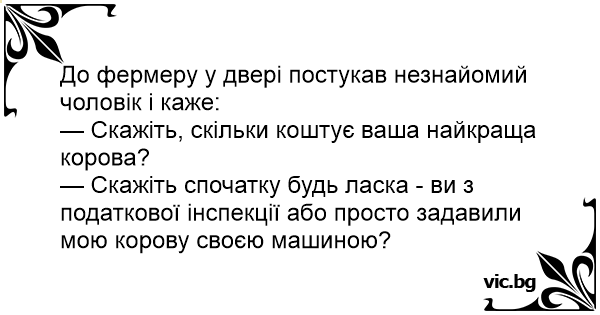 — Скажіть спочатку будь ласка - ви з податкової інспекції або просто задавили мою корову своєю машиною?