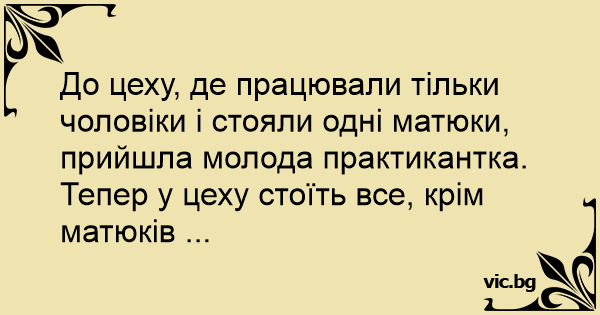До цеху, де працювали тільки чоловіки і стояли одні матюки, прийшла молода практикантка. Тепер у цеху стоїть все, крім матюків ...