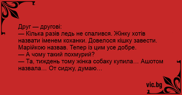— Кілька разів ледь не спалився. Жінку хотів назвати іменем коханки. Довелося кішку завести. Марійкою назвав. Тепер із цим усе добре.