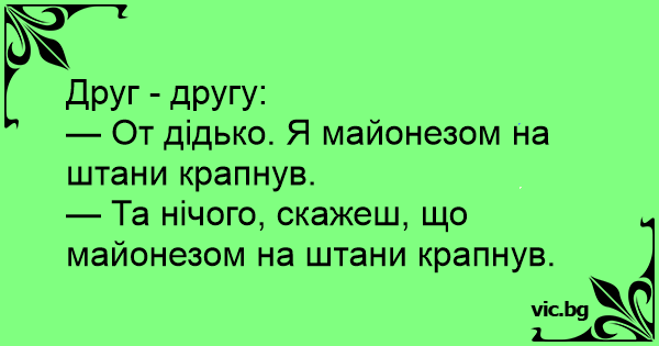 — Та нічого, скажеш, що майонезом на штани крапнув.