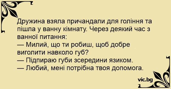 Дружина взяла причандали для гоління та пішла у ванну кімнату. Через деякий час з ванної питання: