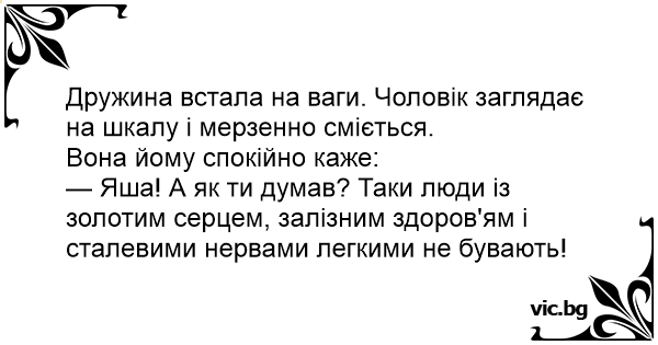 Дружина встала на ваги. Чоловік заглядає на шкалу і мерзенно сміється.