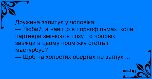— Любий, а навіщо в порнофільмах, коли партнери змінюють позу, то чоловік завжди в цьому проміжку стоїть і мастурбує?