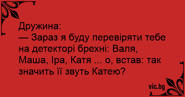 — Зараз я буду перевіряти тебе на детекторі брехні: Валя, Маша, Іра, Катя ... о, встав: так значить її звуть Катею?