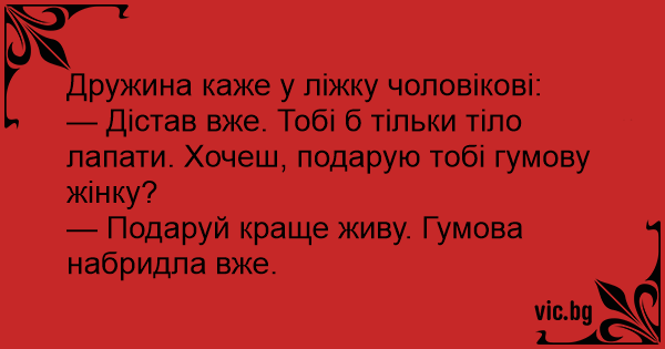 — Дістав вже. Тобі б тільки тіло лапати. Хочеш, подарую тобі гумову жінку?